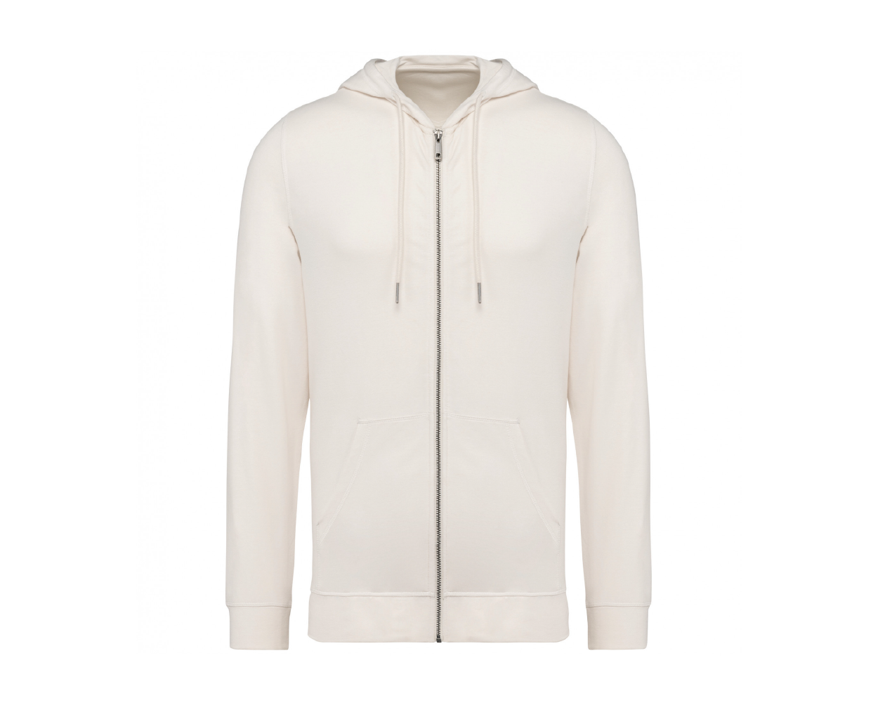 48% modal TENCEL™ / 47% cotone biologico / 5% elastan. 260 g/m². Taglio aderente. Tessuto ultra morbido. Mezzaluna sulla schiena. 2 tasche a canguro. Zip in metallo riciclato.